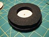 - Z pěnové gumy se vyříznou obruče. Vnitřní průměr je potřeba udělat menší aby guma na disku držela i bez lepení a při následném opracování se na disku neprotáčela. Na kolečku o celkovém průměru 82mm mám vnitřní otvor v gumě o cca 10mm menší než je vnější průměr mezikruží z balzy.
