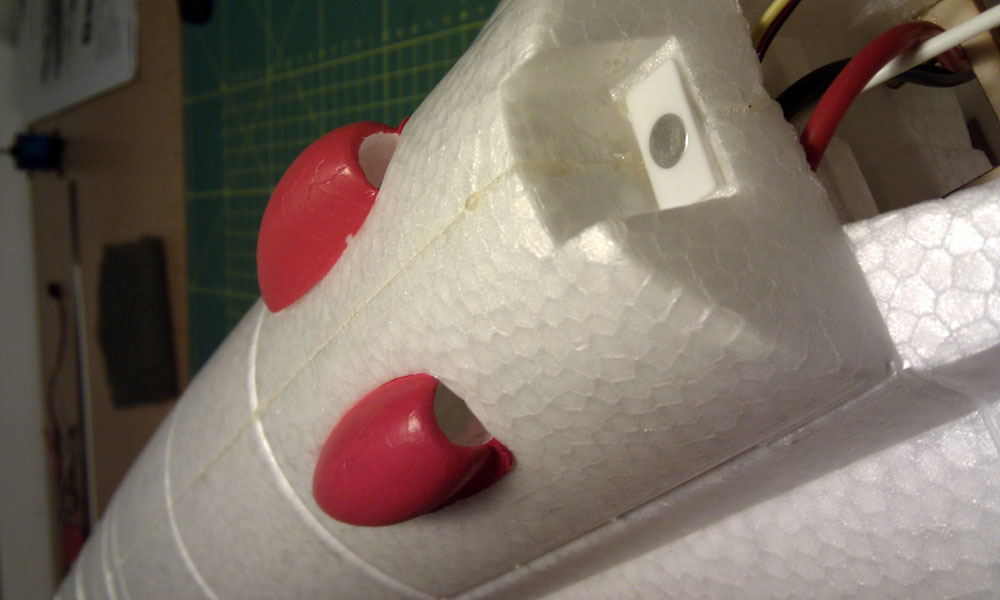 Z internetového obchodu konečně dorazily další komponenty – dmychadlo, motory a plastové figurky pilotů. Dmychadlo sice ve stavebnici bylo, jenže bez unašeče, kterým bych vrtuli dmychadla připevnil na hřídel motoru. Stavebnicová vrtule byla určena pro nějaký mě neznámý typ unašeče, který bych musel nechat vyrobit. Zvolil jsem trochu pohodlnější a možná i levnější variantu koupě nového dmychadla GWS kde je kleštinový unašeč součástí balení. Komponenty nachystány takže jsem začal na elektroinstalaci. Doma jsem měl historický regulátor Dynam 70A (bez BEC). Předpokládaný odběr motoru měl být do 30A takže by jistě stačil regulátor menší, ale když jsem se tak koukal po vhodném typu zjistil jsem, že hmotnostní úspora na menším regulátoru bude minimální a navíc, víme dobře jak to s těmi parametry regulátorů je, že? Regulátor je umístěn ve hřbetu modelu, kousek před dmychadlem. Tlusté kablíky regulátoru jsem nahradil menšími, k baterii jsem dal delší kablíky. Regulátor jsem opět zasrmštil do průhledné bužírky a v ploše chladiče jsem bužírku odřízl. Protože regulátor nemá BEC přiletoval jsem ke konektorům ještě kablík pro připojení externího UBEC. Celou sestavu regl+kabely jsem zasunul do hřbetu a připojil motor dmychadla (žádné konektory, pěkně přiletovat natvrdo). Tady se asi hodí zmínit se o motorizaci. Už v úvodu jsem zmínil uvažovaný pohon dvěma tříčlánky LiPol 1300mAh, tzn. 3S2P1300mAh. Pro tuto baterii jsem koupil dva motory lišící se ot./V, jeden má 4200ot./V, druhý 4300ot./V. Samozřejmě zásadní rozdíl je také v odběru. Zatímco první by měl z baterie brát 22,7A (z plně nabité baterie bere na zemi až 26A) druhý by měl brát až 36A (reálný odběr zatím nezměřen). Prozatím jsem osadil méně výkonný motor. I tak pro mě jako člověka dmychadel neznalého budí na plný výkon točící se dmychadlo patřičný respekt, jak se říká „je to hukot“. Dva trojčlánky jsou umístěny za sebou, jeden je zasunut do prostoru pod servo a přijímač, druhý je umístěn na výrobcem určené místo kde je v trupu osazena překližková destička s páskem suchého zipu. Pod destičku jsem vložil UBEC, je konektorem připojen ke kablíkům regulátoru, které se připojují k baterii. Původně jsem chtěl UBEC na kablíky rovnou přiletovat, ale musel bych letovat přímo na modelu protože sestavu regl+kabely+UBEC bych hřbetem modelu neprotáhl. A letovat v polystyrenu se mi moc nechtělo. Na závěr instalace pohonu ještě řeším přístup vzduchu k regulátoru. Přes kabinu se tam nedostane, skrze nasávání vzduchu k dmychadlu také asi ne. Naštěstí na hřbetu trupu za kabinou jsou dva kryty nasávání. Odlepuji je, vydlabábám, do trupu vrtám trubkou šikmý otvor o průměru 10mm a krytky lepím zpět. Zda to bude k něčemu dobré nevím, ale rozhodně to nebude horší.