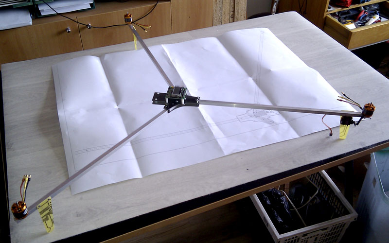 Tak zase na mě padla hrozná touha postavit něco lítacího co ale není letadlo. Máte taky někdy ty stavy, že prostě cítíte, že by vaše dosavadní činnosti či snahy potřebovaly trochu okořenit? Já jo. Vloni to byla stavba Bellanky na brno MVVS8 a k tomu ještě elektrodmychadlová stíhačka T-45. Tak velké éro (Bellanku) jsem ještě neměl a dmychadláka taky ne. Neuplynul ani rok a je to tu znovu. Tentokrát jsem se zhlédnul ve vrtulnících co ale mají tři a více vrtulí. Klasický vrťas mne neláká. Jakousi shodou náhod jsem dal řeč s kamarádem od kombatu – Petrem Starkem a ejhle. On už nedávno postavil quadrokoptéru a kromě bohatých zkušeností z létání se navíc chystá postavit další. Chtěl zase quadro, já chtěl ale trikoptéru …. nedalo moc práce a i Petr začal chtít trikoptéru :-).