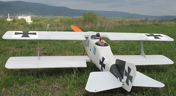 Na spodní straně spodního křídla je v místě zadního šroubu nalepena výztuha pro opření podvozku z překližky tl. 1mm. Na horním křídle jsou trafopájkou s tvarovaným očkem z měděného drátu proříznuty drážky ve tvaru "V" pro oddělení křidélek resp. vytvoření jejich zavěšení. Křidélka mají podobný tvar jako originál ale jsou zvětšena. Pro jejich ovládání jsou použita dvě serva HXT500 (každé křidélko má své servo). Serva jsou blízkou křidélek a spojení s nimi je jen krátkým táhlem z ocel. drátu 0,8mm na jehož koncích jsou ohyby do "Z". Kablíky od serv jsou prodlouženy a zatlačeny do mělkých zářezů v křídle. Aby křídlo plynule navazovalo na trup jsou v horní části po stranách žebra doplněny kousky epp které jsou zabroušeny zároveň s povrchem trupu. Na spodním křídle to lze udělat také protože trup má oválný průřez. Proti otlačení hlavami šroubů jsou na horní povrch horního křídla nalepeny překližkové podložky o průměru 20mm a tloušťce 1mm.