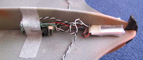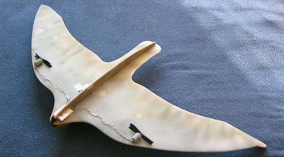 Na modelu není nic co by mohlo překvapit. Je slepen UHU-PORem z climaporu tl.3mm, oproti podkladům jsem nevyřezával "díly kapotáže" RC vybavení - včetně řezání práce tak na 10min, s zavadnutím UHU-PORu 15min. Následně je přilepeno RC vybavení s motory - lože motorů UHU-PORem, ostatní elastickou textilní páskou 3M tak aby bylo těžiště modelu ve správné poloze. Zálet spočívá v nastavení velikosti vychýlení elevonů a případně doladění trimu na vysílači pro rovný let.